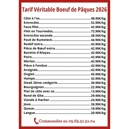 Nous vous proposons, d'acheter au détail, des pièces de ces bœufs gras de Pâques : Côte à l'os, Entrecôte, Faux-Filet, Basse côte à griller, Rosbif, Filet, Pièce de Boeuf extra, Pavé de Rumsteck, Pièce à fondue, Bavette d'aloyau, Poire, Merlan, Araignée, Bifteck, Jarret, Rond de gite, Viande à hacher, Bourguignon, Pot au feu, Queue, Langue, Joue,...