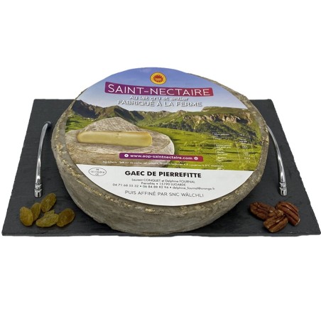 Le Saint Nectaire est un fromage AOP depuis 1955. Sa fabrication a lieu entre le Puy-de-Dôme et le Cantal, c'est la plus petite zone AOP d'Europe. L'AOP Saint Nectaire est très strict, de l'élevage des vaches jusqu'à l'affinage des fromages. Le savoir-faire de la fabrication de ce fromage se transmet de générations en générations. C'est un incontournable de vos plateaux de fromages !
