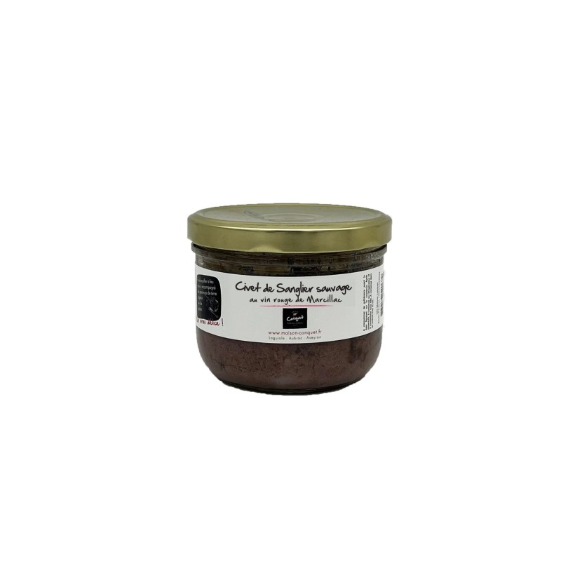 Ingrédients : Viande de sanglier sauvage 70%, VIN rouge de Marcillac AOP 20% (sulfites), huile de tournesol, farine de BLE, oignons, carottes, sel, poivre.